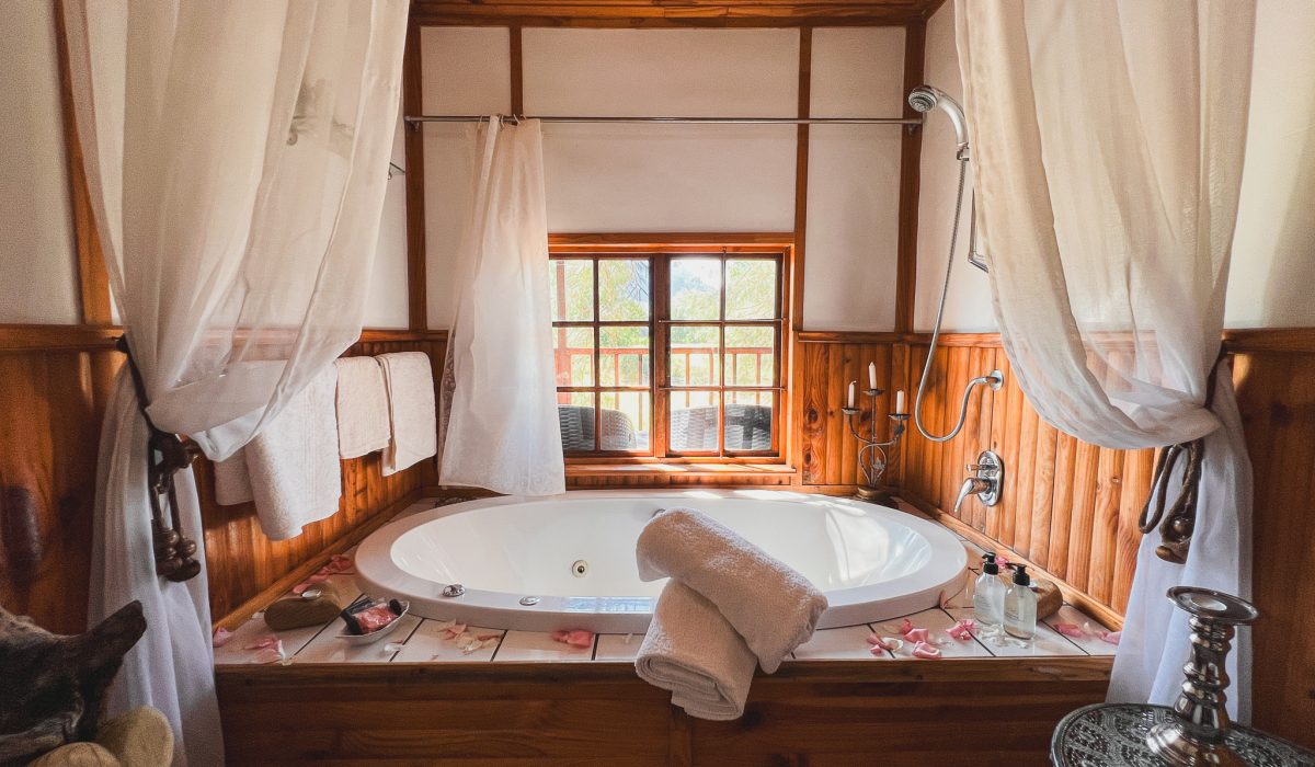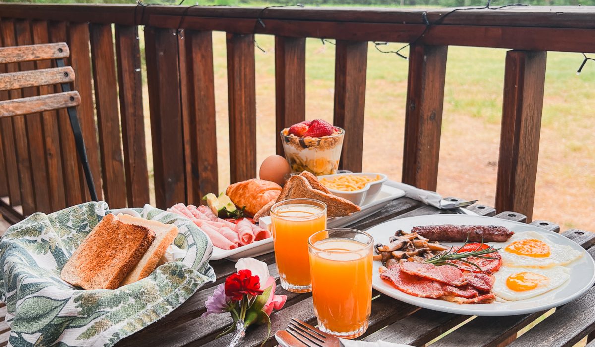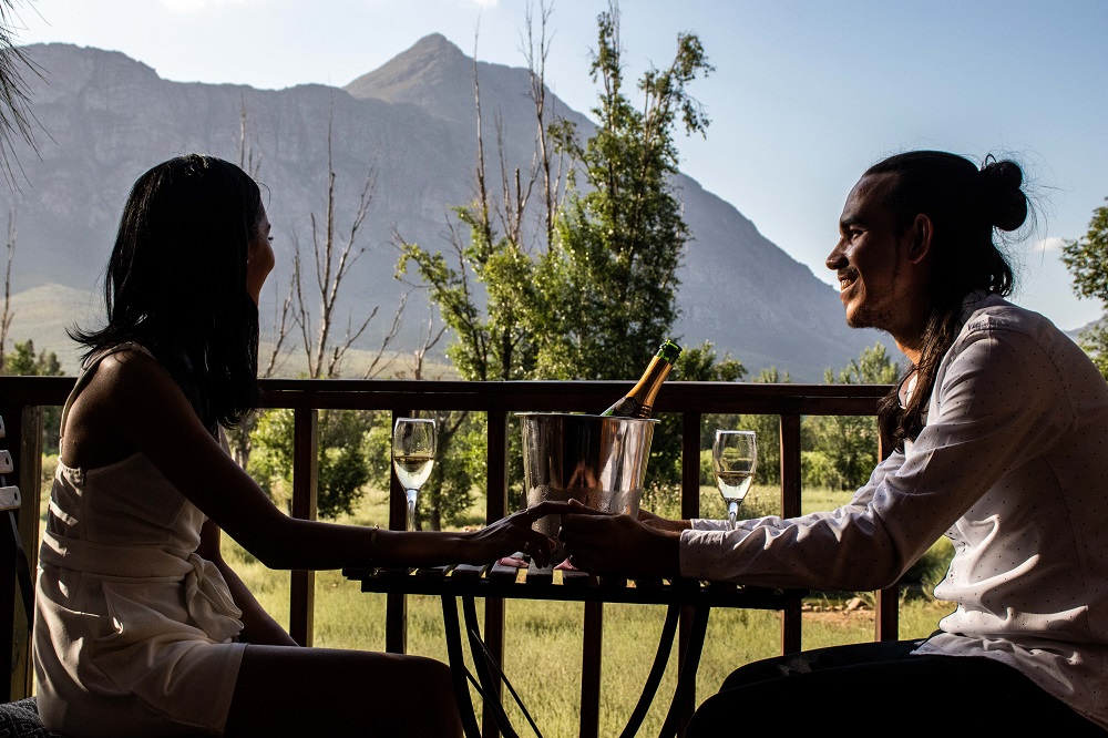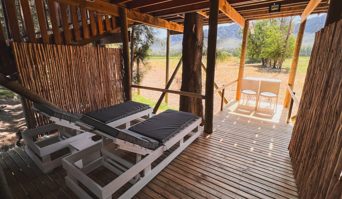 Perfect lovers retreat, with queen size bed, and en-suite bathroom with large spa bath, air-conditioned and private balcony with views of game, mountains and orchards . Breakfast served directly to tree house.