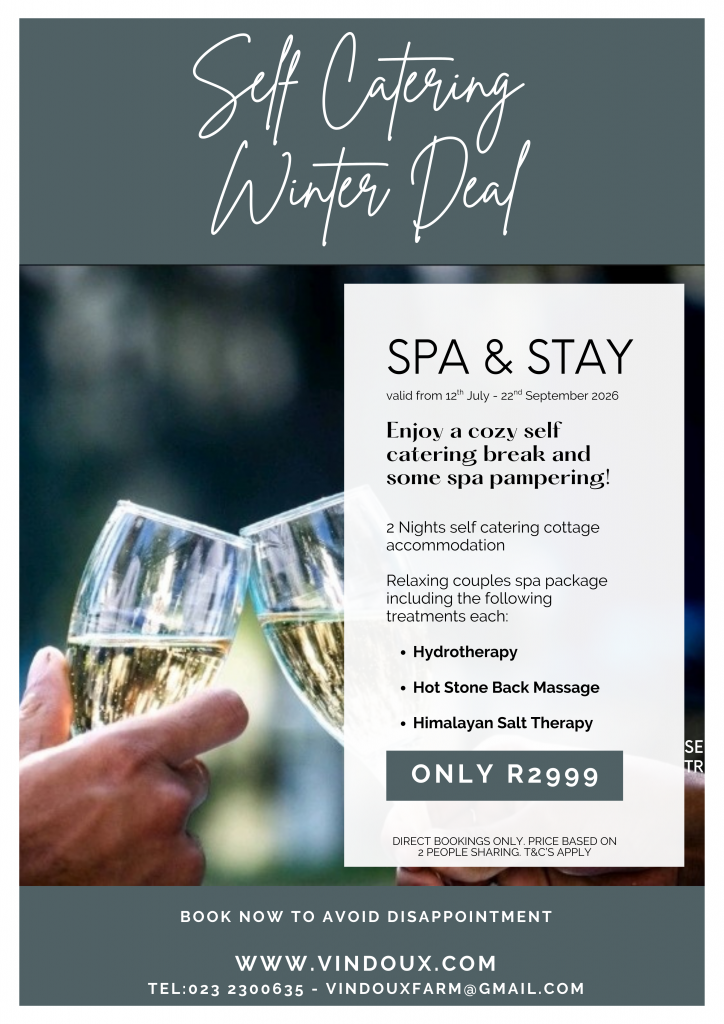 At Vindoux, we take pride in trying to think of the little things to make your stay even more perfect. With that in mind, we have created several different packages to suit our guests’ needs. Whether you are looking for a special “Babymoon” holiday before your little bundle arrives, a honeymoon treat or a relaxing spa break, we have a selection of packages on offer, incorporating spa treatments, accommodation and extra special goodies. Or for that truly personal touch, please contact us and we can try to put something unique together for you.